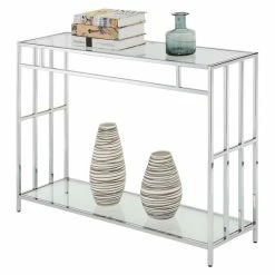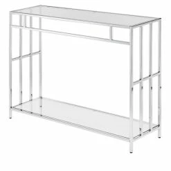 Renovate your home decor with this glass console table by Silver Orchid. This console table offers of display and storage room with its two ample shelves, enough space for all your out-the-door essentials or most beloved mementos. This multi functional piece is designed with unique side frames that adds to its sleek and clean-lined silhouette. The table is constructed with a metal frame and reliable tempered glass tiers.