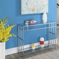 Renovate your home decor with this glass console table by Silver Orchid. This console table offers of display and storage room with its two ample shelves, enough space for all your out-the-door essentials or most beloved mementos. This multi functional piece is designed with unique side frames that adds to its sleek and clean-lined silhouette. The table is constructed with a metal frame and reliable tempered glass tiers.