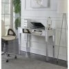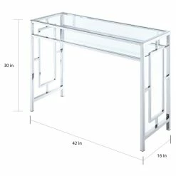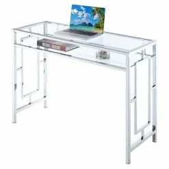 Work in style with this chrome desk with shelf by Silver Orchid. Both the tabletop and shelf are crafted from tempered clear glass, making it a breeze to locate all your work supplies. The chromed metal frame with signature geometric side designs, makes this item sturdy enough for your laptop, a lamp, and your notebooks. With its innovative design, it flaunts a contemporary style that will refresh your home office or den.