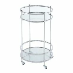 Entertain your guests with the glamourous Silver Orchid Agnew 2 Tier Round Glass Bar Cart. This must-have beautiful piece boasts a chic silver chrome frame combined with two tiers of clear tempered glass shelves. Great for entertaining, this luxe bar on wheels offers plenty of space to pour and store favorite beverages. Roll this cart to wherever you may need it on four swivel caster wheels, two of which lock, allowing for easy mobility and stability. This cart is the perfect serving piece complete with two tempered glass shelves for easy cleanup.