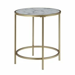 Add luxury to your home with this faux marble round end table from Silver Orchid. Featuring a contemporary style with glamorous finishes, this end table will upgrade your decor and charm its way into becoming a staple in your home. Its clean-lined silhouette and ample table top ensure the perfect display space for your favorite collectibles. The base is crafted from gold powder coated metal and table top is made of MDF and finished with a beautiful glossy white faux marble with gray veining, this table will beat the test of time while ensuring easy maintenance. With its simplistic design the Gold Coast Faux Marble Table can fit seamlessly into your living room as an end table or add some glam to your bedroom as a nightstand.