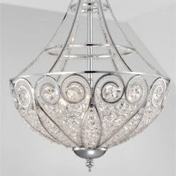 Set your dining area apart with this shimmering crystal chandelier from Silver Orchid. The chrome-finished metal fixture is detailed with scrolled accents and a crystal shade for modern shine. Easily adjust the wire and hanging chain to accommodate your ceiling height.