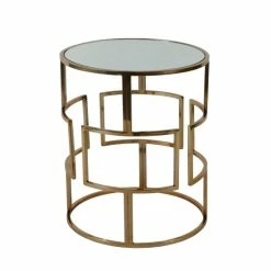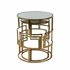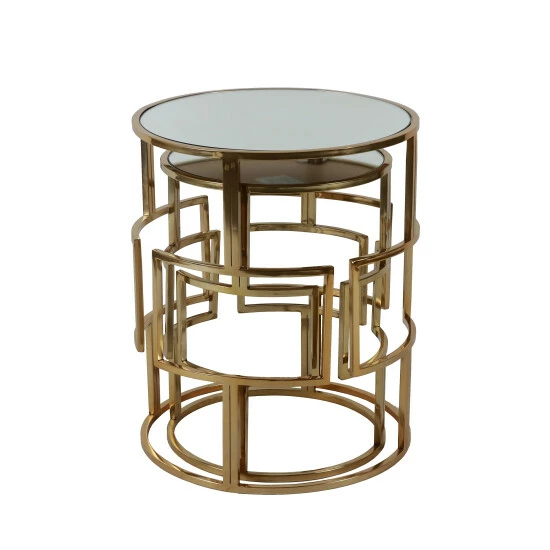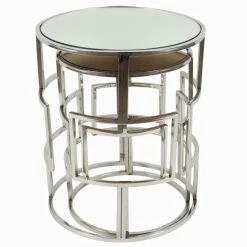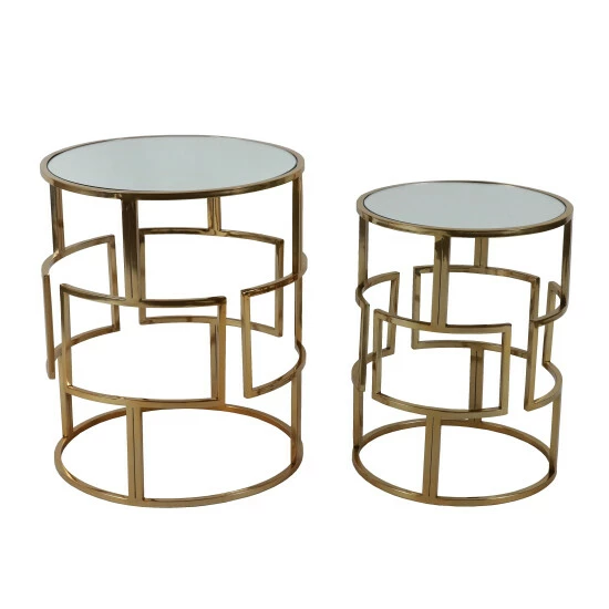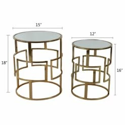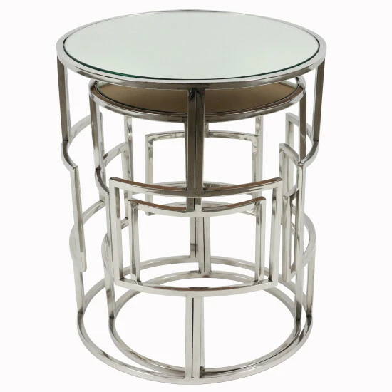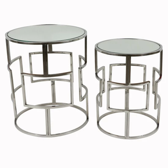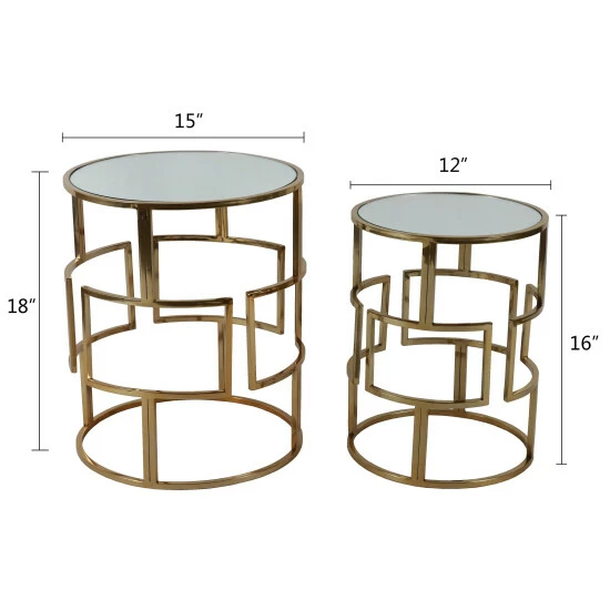 Art Deco styling makes a more approachable look in this daring, yet romantic set of nesting side tables. The round base metal base comes in a metal finish and is built in an allover open-rectangle pattern. The end tables are each inset with a circle mirror tabletop for reflective beauty. The set nests together for an intricate and lovely effect together, or separate for coordinating functionality.
