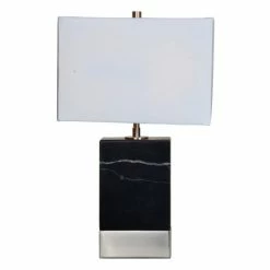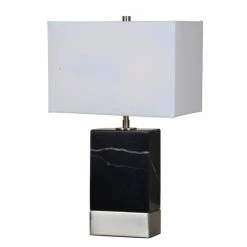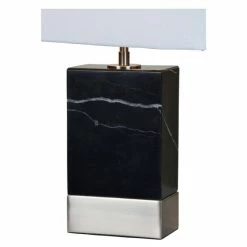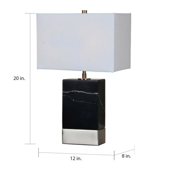 The satin nickel finish and solid stone design of this decorative table lamp brings metropolitan glamour to modern interiors. Delicate white veins throughout the black marble lamp base will vary from piece to piece, making each lamp one of a kind. With a rectangular shape that mimics the strong angles of the lamp base, the coordinating off-white fabric lampshade prevents ornate from being over the top.