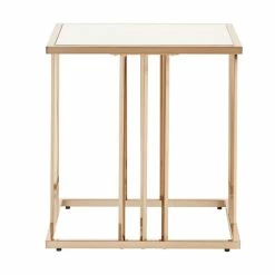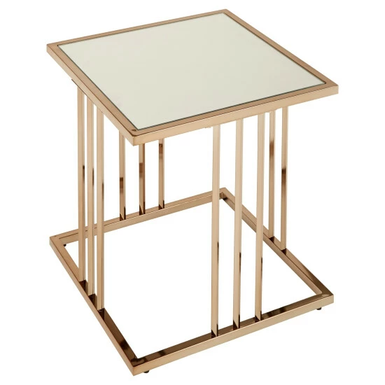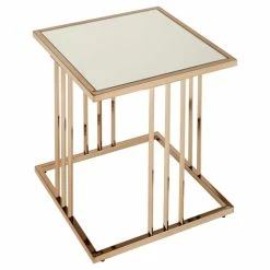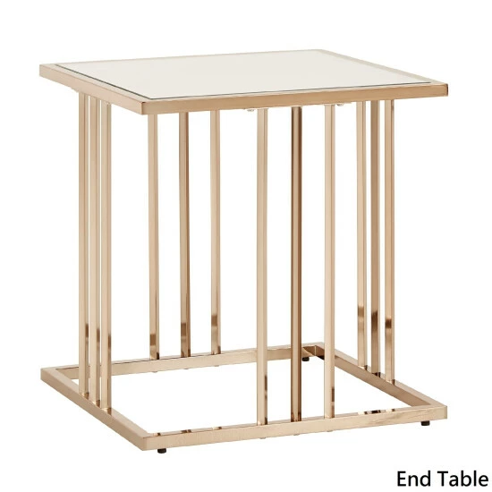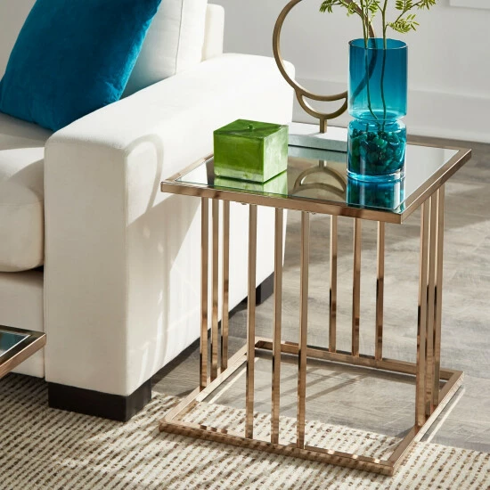 This champagne gold finish end table brings serious luxury to any room in your home. A beautiful mirrored table top is connected to the bold metal base with a shiny, champagne gold frame that features three parallel bars on each table side. Place this collection in your home for a sophisticated, glam style that’s sure to make a statement.