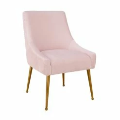 Add some extra seating to your home with this pleated blush velvet side chair. This chair is elegantly handmade with a curved design and fab gold stainless steel legs. The solid kiln dried wood frame with webbing support makes this a long-lasting addition to your home. Perfect at the dining table or in your living room, this versatile side chair’s pretty blush color lends feminine charm to any space.