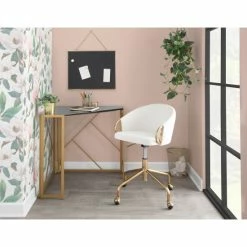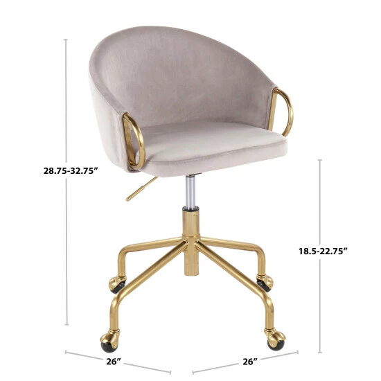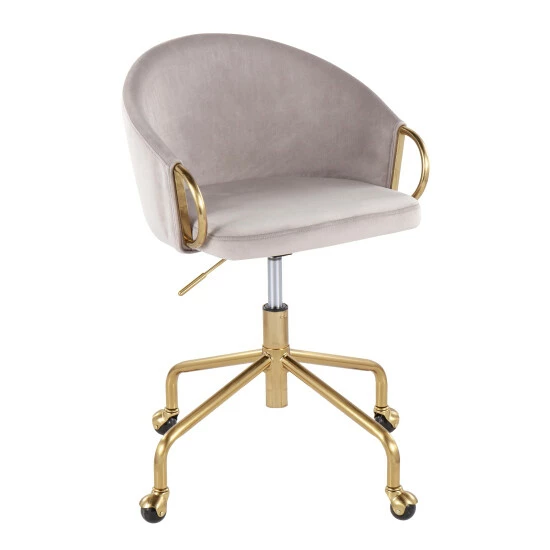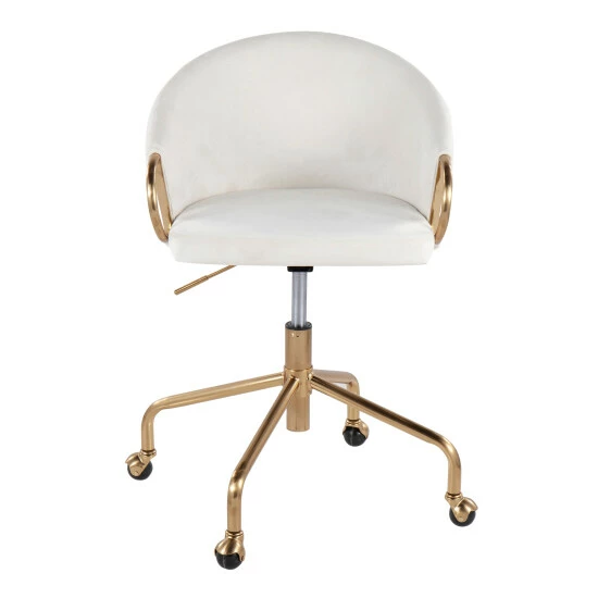 Chic modern style shines bright with the unique design of the Battista Task Chair. The Battista features a low rounded backrest, sleek gold armrests, and a gold metal 4-star base with casters that is adjustable to your preferred height. Upholstered in lush velvet and available in various bold colors.