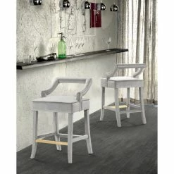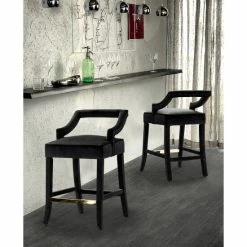 This counter stool is the ideal blend of contemporary design and comfortable function. Clean architectural lines are created by a sculptural velvet upholstered tapered wood frame base while a half back, slope arm velvet upholstered seat and gold tone footrest bar provide for superior comfort. The Cassia counter stool works great in multiples and sits beautifully in bar, kitchen, dining and lounge areas.
