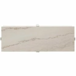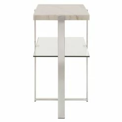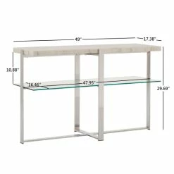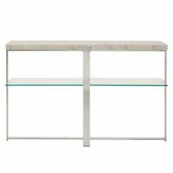 Complete your glam themed living space with this stunning marble-top chrome sofa table. This beautiful, marble table top provides a gorgeous backdrop for a luxurious styled space, while the chrome finish of the sturdy crossed metal base adds a luminous, statement making aspect to an extravagant setting. Providing the perfect spot to display your most valuable home decor items, this gorgeous sofa table also includes a middle glass shelf so additional novelty items can be shown off.
