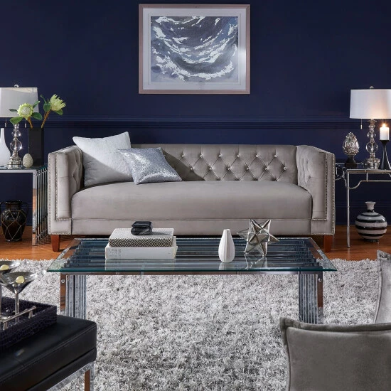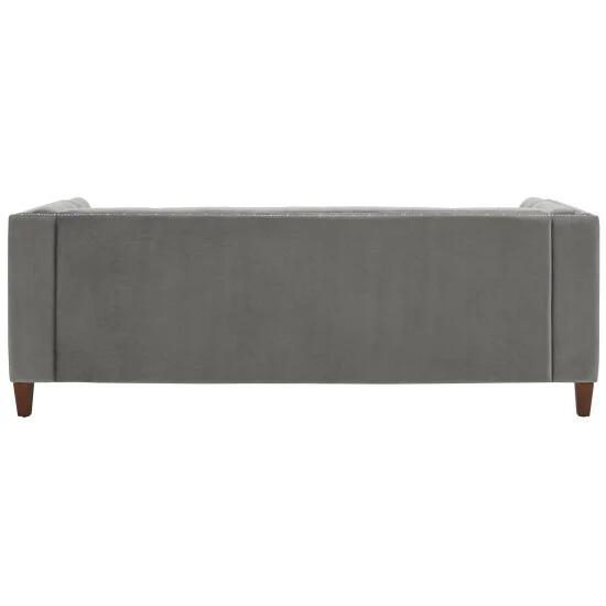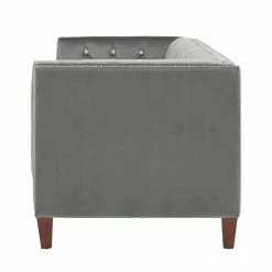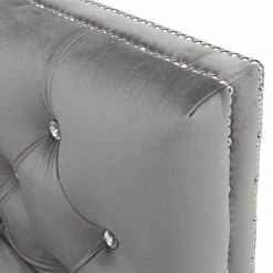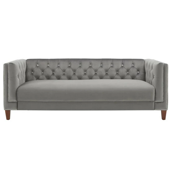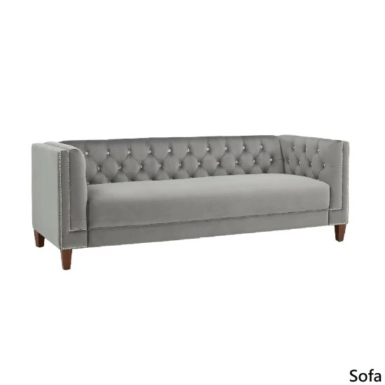 Sit in glam style with the Bergere seating collection from Silver Orchid. The rubberwood frames are softened with foam fill, upholstered with grey velvet, and detailed with jewel tufting and nailhead trim. Choose from a sofa or a loveseat to fit your space and seating needs.