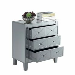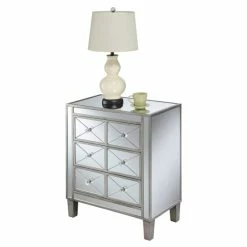 Bring glamour and charm into your home decor with this 3-drawer mirrored end table from Silver Orchid. It features a glam style to update your ensemble. Created from MDF and decked out with mirrors, this side table is a must have piece. Its tapered feet are made of solid fir wood and finished with non lead based paint. Features a clean lined silhouette with 3 pull out drawers, each adorned with engraved X detailing and two faux crystal rosette knobs.