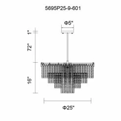 Dimensions: H 16′ x W 25′ x D 25′ – Chrome Finish – Requires 9 E12 Bulbs Max 60 W (Sold Seperately) – Comes with 72 ‘ of Rod – One year warranty against manufacturers defect.