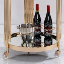 This compact bar cart with a dash of glamour has a lower mirrored shelf with wine storage and an upper mirrored surface. The caster wheels make it easy to move your bar cart exactly where you need it.