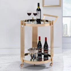 This compact bar cart with a dash of glamour has a lower mirrored shelf with wine storage and an upper mirrored surface. The caster wheels make it easy to move your bar cart exactly where you need it.