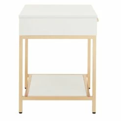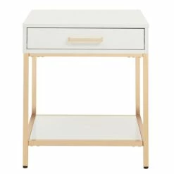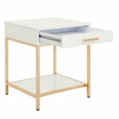 Add a touch of glamour to your living room or bedroom decor with this gorgeous end table from Silver Orchid. Featuring a glossy white and goldtone finish, this table elevates the decor of any room. This end table includes a drawer and lower shelf and is also ideal as an elegant nightstand.