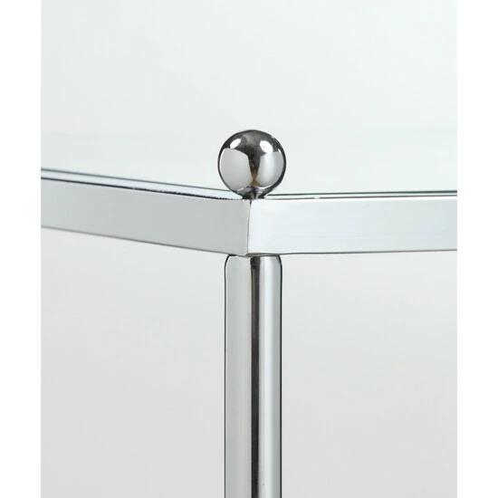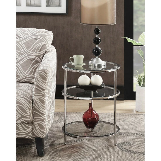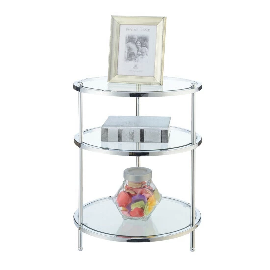 Accentuate the contemporary style of your space with this Silver Orchid Farrar end table. Perfect for holding your reading lamp and displaying your decorative items, the end table features a round metal frame in a bright chrome finish. Three-Tiers of clear glass shelves complete the open and elegant look of this charming end table.
