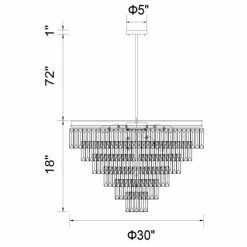 Dimensions: H 18′ x W 30′ x D 30′ – Chrome Finish – Requires 15 E12 Bulbs Max 60 W (Sold Seperately) – Comes with 72 ‘ of Rod – One year warranty against manufacturers defect.