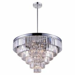Dimensions: H 18′ x W 30′ x D 30′ – Chrome Finish – Requires 15 E12 Bulbs Max 60 W (Sold Seperately) – Comes with 72 ‘ of Rod – One year warranty against manufacturers defect.