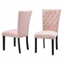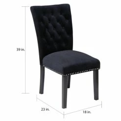 Featuring button tufted velvet upholstery and sturdy poplar wood construction, this set of dining chairs will provide a clean and traditional look. They come in your choice of color with chrome nailhead trimming that will add plenty of beauty and elegance to any setting. The foam-filled cushions ensure comfortable seating.
