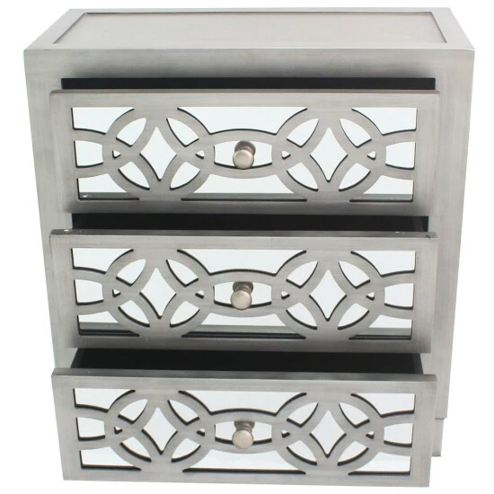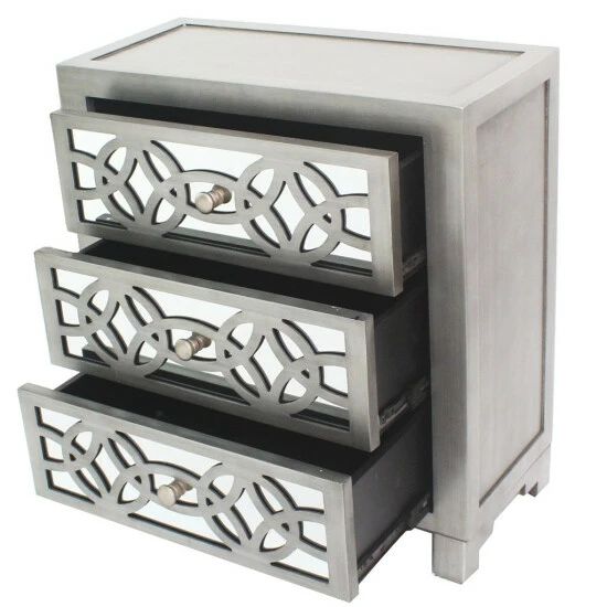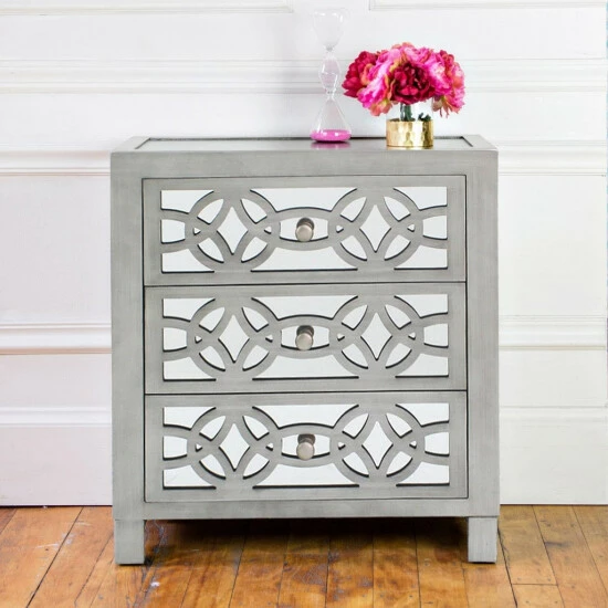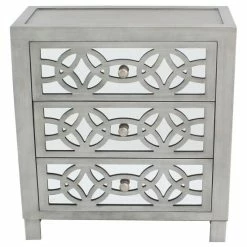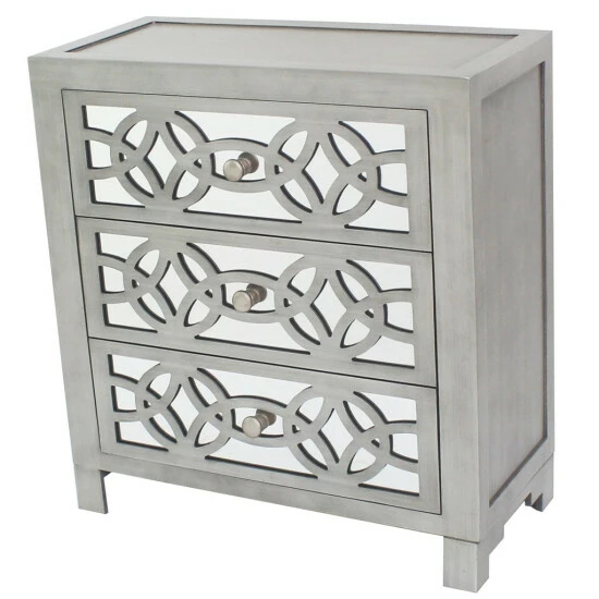 Scintillating glamour meets eye-popping personality in the distinctive aesthetic of this three-drawer chest. Offering a touch of vintage appeal for some shabby chic expression, this chest is sure to bump up your decor scheme. Flaunting details like a mirrored face overlaid with intricate cutouts, this chest makes for a unique and fabulous accent piece.