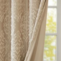 Lend some lavish style and luxury to your living space with this blackout panel curtain. This elegant window panel flaunts a knitted jacquard damask design in rich hues, creating glamorous sheen and texture. The heavyweight fabric features a foam-back and bonding finish that blocks out all sunlight and provides a maximum protective barrier against noise intrusion.