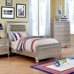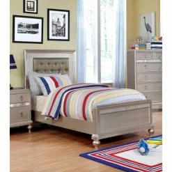 This grand bed possesses opulence in every inch. A tailored button tuft faux leather headboard looks stunning framed in wood molding trim. Mirrored tiles provide sparkle on the bed’s footboard.
