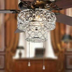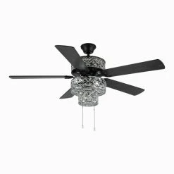 Three layers of stunning, shiny silver and clear faceted K-9 crystals. Illuminate your room in style with this punched metal and clear glass ceiling fan. Six lights highlight the 145 glass crystals on all three tiers within the upper and lower components for the ultimate in shine and design. Five wood grain textured blades allow for maximum air movement and are reversible. One side features a traditional mahogany finish, while the opposite side features a sleek, antique black color. Pull chain switches allow for manual power off/on, light operation, and three-speed motor (reversible). A short 4″ down rod and longer 21″ down rod are included for two display options, as well as flush mount. Includes: Two (2) dimmable E12 LED 6W/40W incandescent equivalent and Four (4) dimmable E12 LED 1W/15W incandescent equivalent warm white light bulbs. This item must be hardwired and installed by a qualified electrician.