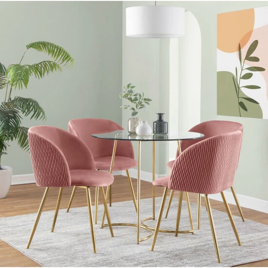 Surround your dining table with the beauty of the Harding Pleated Waves Chair. Featuring a sophisticated velvet upholstery that will tie in perfectly with your contemporary decor, the ultra-comfortable padded bucket seat is complemented by tapered legs and a velvet pleated pattern on the backrest. Available in a variety of color combinations, choose the color that ties in with your decor!