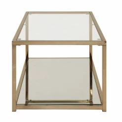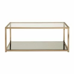 This Hartuaย coffee table from Silver Orchid is a fine example of the open-concept, straightforward elegance of modern design. The Hartau’sย rectangular-tube frame is finished in a beautiful gold tone that is accented by the clear glass top. Finish with a few small houseplants and vintage novels on top for a curated look.ย ย