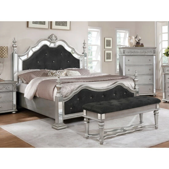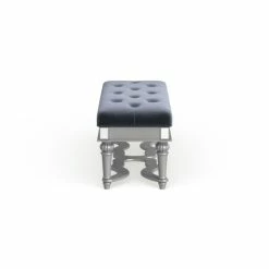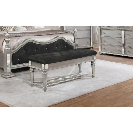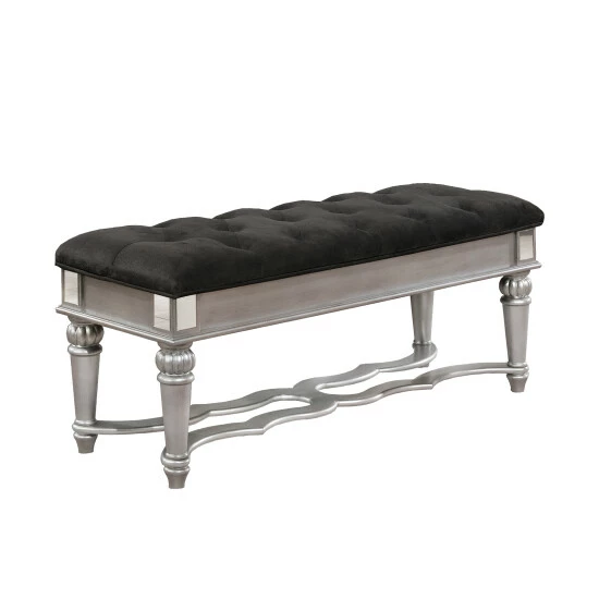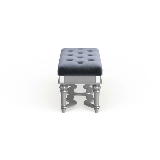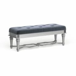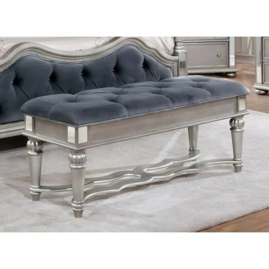Elevate the look and feel of your living space with this glam styled bedroom bench. This bench is finished in a lustrous grey color and features unique design elements which give it high visual appeal. A sumptuous slate blue velvet button-tufted upholstery makes this bench as functional as it is fashionable. Mirrored accents and an elegant trestle base and legs contribute to the beauty of this bench. Match this bench with our collection Silver Orchid Heston Glam Grey Velvet Tufted Panel Bed