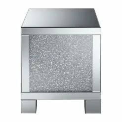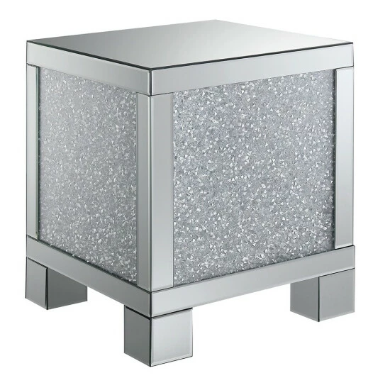 This silver block-style end table will look great in a contemporary style living room. It has clean, straight lines for a look that’s fresh and modern. Short block style legs impart a bold stance. Sides are finished in a distinctive pattern that matches well with the otherwise solid silver finish of the legs and top. Place a silver accented lamp on the square table top to customize the look.