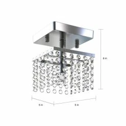 Modern and elegant, this chrome chandelier will spruce up any home. It is about 5 inches wide and 6 inches high. Its dangling clear crystals showcase an elegant vibe which reflect the light perfectly.