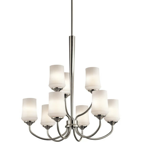 Brighten up your entryway or dining room with this sleek steel chandelier. The brushed-nickel chandelier features two tiers of opal glass shades to complement your contemporary decor.