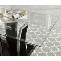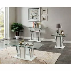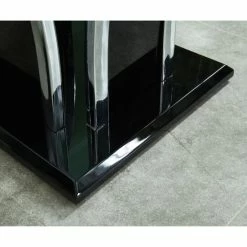 Sophistication and innovation are showcased with the crisp lines and subtle curves of this modern glossy coffee table. Features durable 8mm tempered glass tabletop. The curved, sweeping sides of the lacquer-coated legs are trimmed in lustrous chrome, beautifully offsetting the glossy white or black rectangular base and rectangular beveled glass top that elevate the look and create a modern feel for any den or living room.