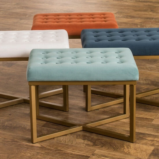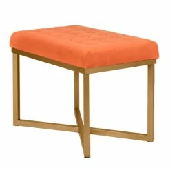 Complement your mid-century living room with this chic ottoman from Silver Orchid. Featuring an open goldtone metal frame with an X-shaped base, this ottoman is topped with a soft cushion upholstered in Tuscany velvet. This ottoman makes a great footrest or an extra seat when needed.