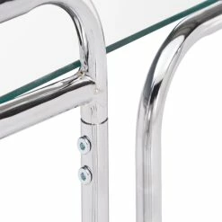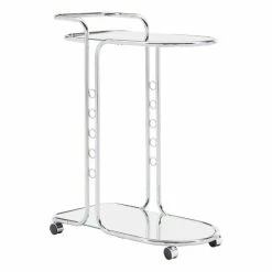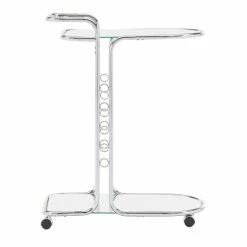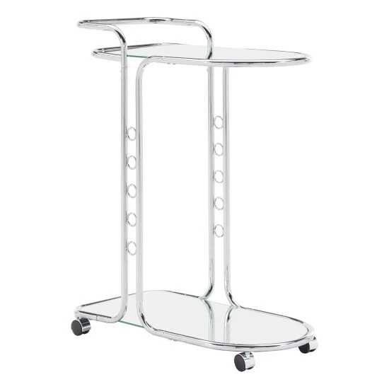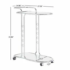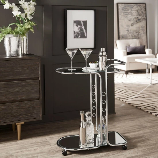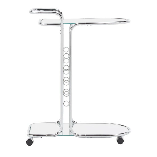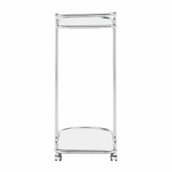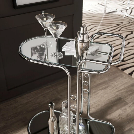 Adding a glamorous touch to your entertaining space, the Murnau chrome finish round edge bar cart is great for hosting parties and special occasions. Two mirrored shelves provide a beautiful place to display your favorite bottles and cocktail necessities, while the modern designed chrome frame makes this cart the perfect addition to a luxurious styled setting. The caster wheels and handle allow easy mobility so you can serve guests in any room of the home.