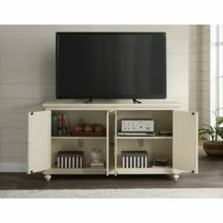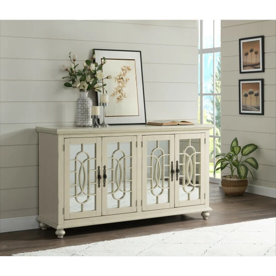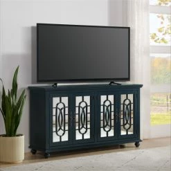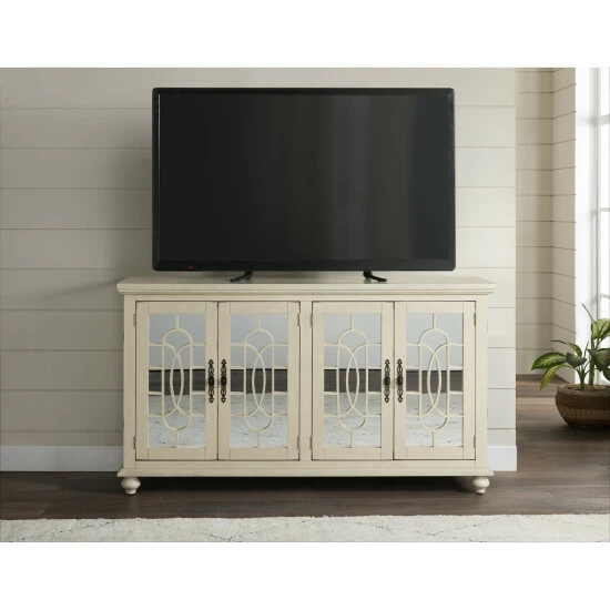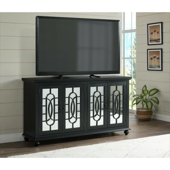 This stunning O’Neil TV Stand features a design inspired by Parisian antique markets. Mirrored glass door fronts are decorated with beautiful trellis details as well as ornate door pulls and turned bun feet. The finish brings a vintage feel to your room. Two removable and adjustable shelves provide lots of versatile storage options for this piece that can be used as a TV stand, credenza or dining room server. Vertical wire management cutouts make it easy to plug in your audio, video or gaming components. This piece will fit most 65-inch flat panel TVs. ย