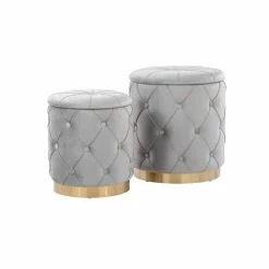 Bring a note of glamour to your home with the chic design of the Ockelbo Nesting Ottoman Set. This set is upholstered in soft velvet with a button-tufted design, cushioned top, and a chic gold metal base. The smaller ottoman nests inside the larger ottoman for a space-saving design. Available in a variety of upholstery color options, choose the one that fits your space the best.