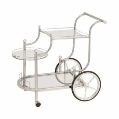 With three different glass serving surfaces, chrome and clear accents, and the ability to easily roll wherever you need it, this Olivia serving cart from Silver Orchid is both beautiful and utilitarian. Load it up with delicacies and drinks for your next party where you can conveniently serve guests.