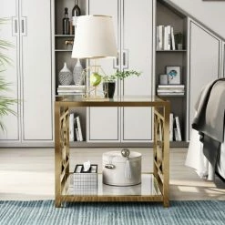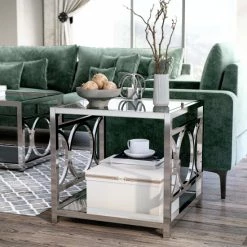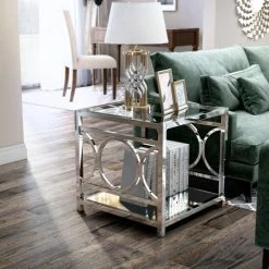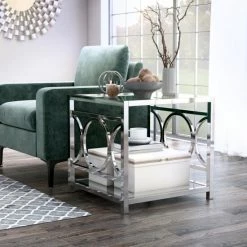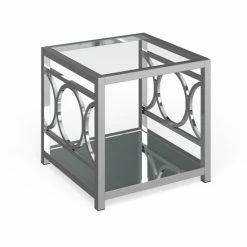 Bring modern appeal to your home with this attractive end table. This table features geometric design accents and a glass top. A polished finish adds some style and charm, while the mirrored glass of the lower shelf Helps to make this item further stand out.ย