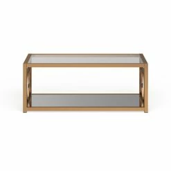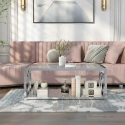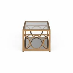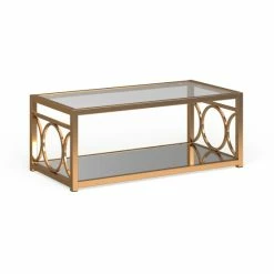 Bring modern shine to your glam living space with the 47 inch Pehrson coffee table. The metal frame features circular cut-outs and a mirrored bottom shelf. Tempered glass tabletop for easy viewing and cleaning. Choose from a chrome or gold finish to complement your contemporary decor.