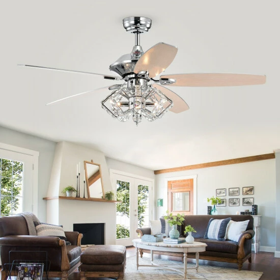 Illuminate any room in style with this silver ceiling fan. This chrome lighted ceiling fan with crystal pentagon shade is the perfect solution. The five reversible wooden blades provide great air flow and flexibility in decorating. A beautiful balance between form and function. Remote Controlled for your cooling convenience.