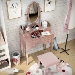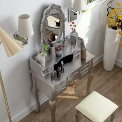 Glam up your makeup routine with this intricately detailed vanity table and stool set. This two-piece set offers up seven drawers worth of storage for easy organization of your morning essentials. An adjustable oval mirror and the comfortable, fabric-upholstered stool make your morning routine easier.