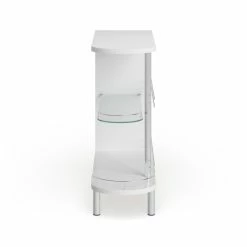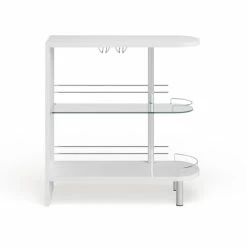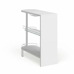 This contemporary bar table offers a sleek design that will highlight your cosmopolitan sense of style. Crafted from white metal and glass shelves to highlight your extensive liquor collection, the bar table includes two shelves for storage and a wine glass holder.