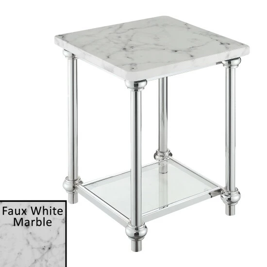 Add elegance to your living space with the Roman II End Table by Silver Orchid. The noteworthy construction was fashioned from materials that create a beautiful contrast. From the white faux marble tabletop to the clear tempered glass shelf held together by a chromed metal frame; this two tier unit will keep your guests in awe and become a staple in your home immediately. Rest assure that the sturdy frame can hold your favorite lamp and your living room essentials. Use in your home office or den and witness its endless versatility. Looking for more? Look for the Roman II Coffee Table by Silver Orchid. Each sold separately. Â
