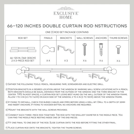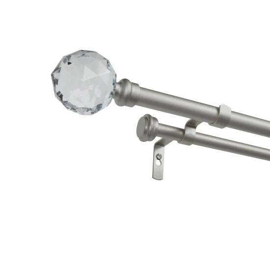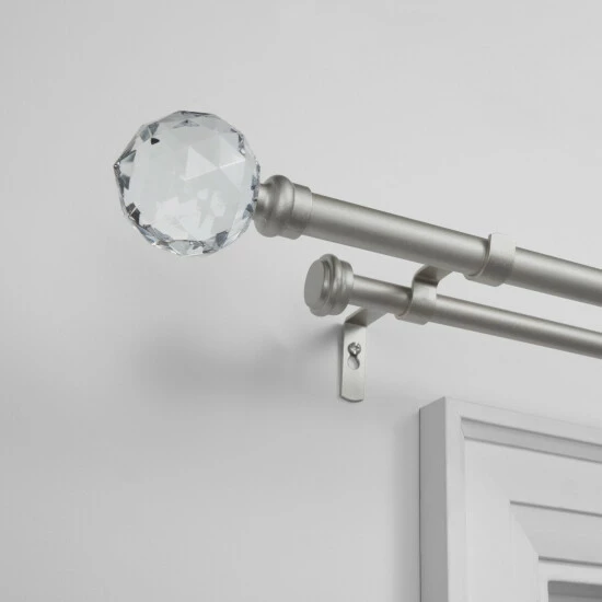 This curtain rod and finial set provides a glamorous touch to your home decor with multi-faceted, clear acrylic sphere shape finials. This set will provide a visually balanced appearance for your window treatments. This double rod and finial set is not only functional by allowing the use of multiple curtain designs at the same time, but attractive as well with the added touch of decorative finials.The iron rods are adjustable and designed to fit a wide range of window widths and has a sturdy 25 lb. capacity that will support flowing sheers to thermal blackout and privacy panels.Accommodates window curtain panels and drapes that are designed with various tops, including rod pocket, pinch pleat, clip rings, grommets, tab top, or hidden back tab top.