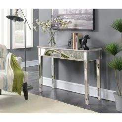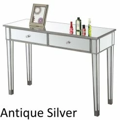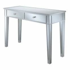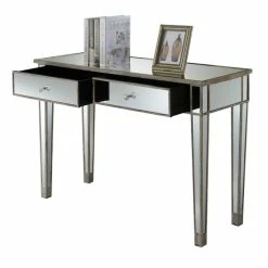 Add some glam to your home with the Silver Orchid Talmadge Mirrored 2 Drawer Desk/Console Table. This chic and sleek desk will bring any room to life with its luxurious glass mirrored panels. Two spacious pull-out drawers on roller slides reveal plenty of room for concealed storage. Stylish crystal faux drawer knobs offer easy accessibility to all your home office or entryway essentials. Constructed from manufactured wood and glass mirrors, this multi-use desk is built to last. Beautiful silver non-lead-based paint surrounds the mirrored frame which gives this carefully crafted unit just the right amount of sparkle. This piece offers much versatility and can be utilized as a desk, console table, or vanity.