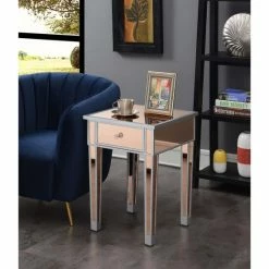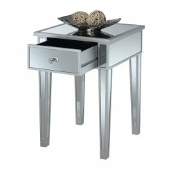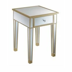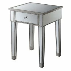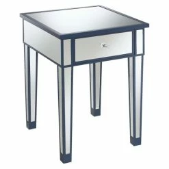 The sleek, stylish aura of this mirrored end table with a useful, ample drawer, will bring life to any space. Its mirrored inlay pairs perfectly with the fir wood base, while faux crystal drawer pulls bring the look together, giving you access to the drawer for a handy and accessible hideaway.