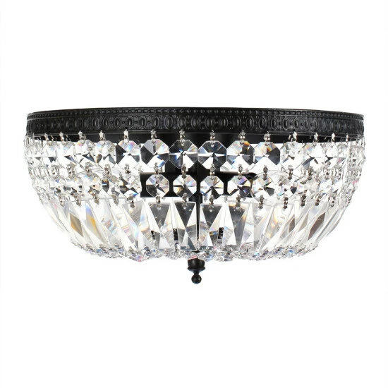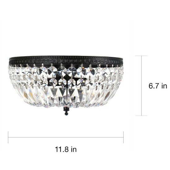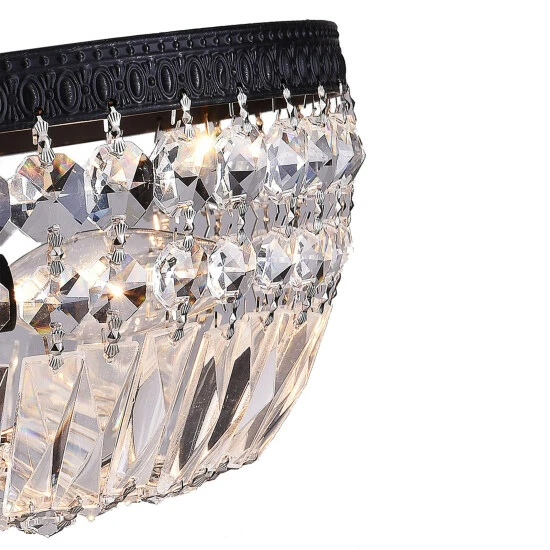 Add serious class to your home with this flush mount chandelier. The impressive fixture features an intricately detailed round iron frame in an antique black finish, and rows of geometric crystals that drop down and join to a pointed finial to form a sparkling basket. The three-light chandelier mounts flush against your ceiling.