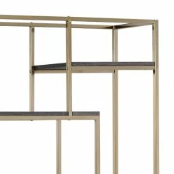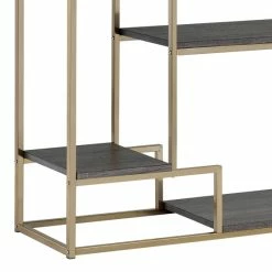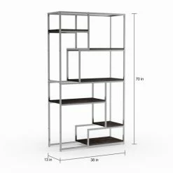 Add a rustic glamorous look to your home with this very chic asymmetrical open bookcase. Available in a chrome or champagne finish, this piece is constructed with six brown wood veneer shelves with a stunning open back concept. The open back lends an airy feel and elegance that allows your trinkets and mementos to shine.